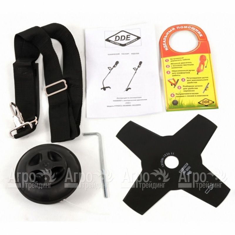 Изделие комплектуется двумя режущими насадками -головкой с леской и четырех -лопастным ножом, заплечным ремнем и вспомогательным инструментом для сборки триммера. Режим подачи лески полуавтоматический. В электрокосе (электрическом триммере) DDE ET1000RD заложена система амортизации, которая снижает воздействие вибрации на руки пользователя. Инструмент целесообразно использовать с наплечным ремнем, который перераспределяет вес триммера способствует меньшей усталости.