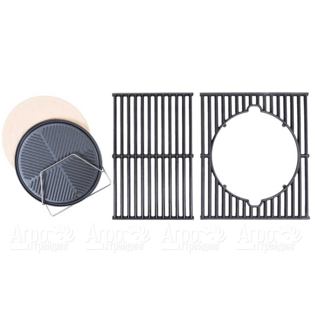 Базовая комплектация: чугунные решетка-противень, решетка-противень с вырезом и сковорода плоская, камень для пиццы, крепеж для аксессуаров набора