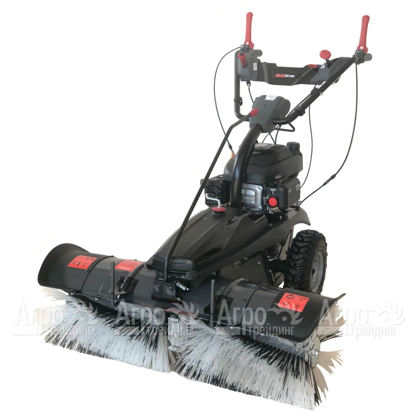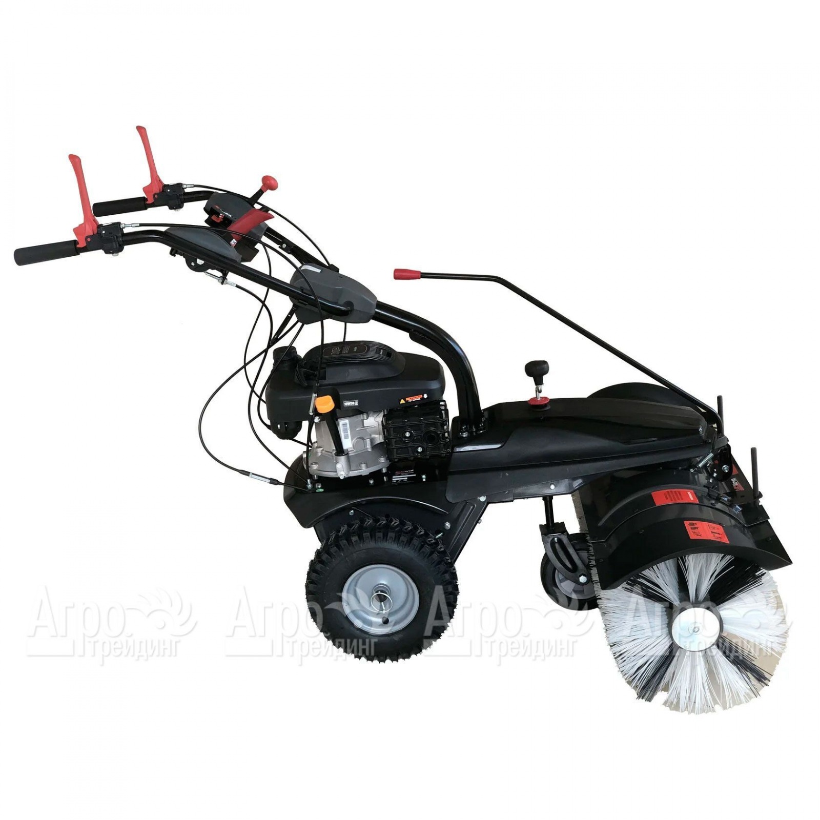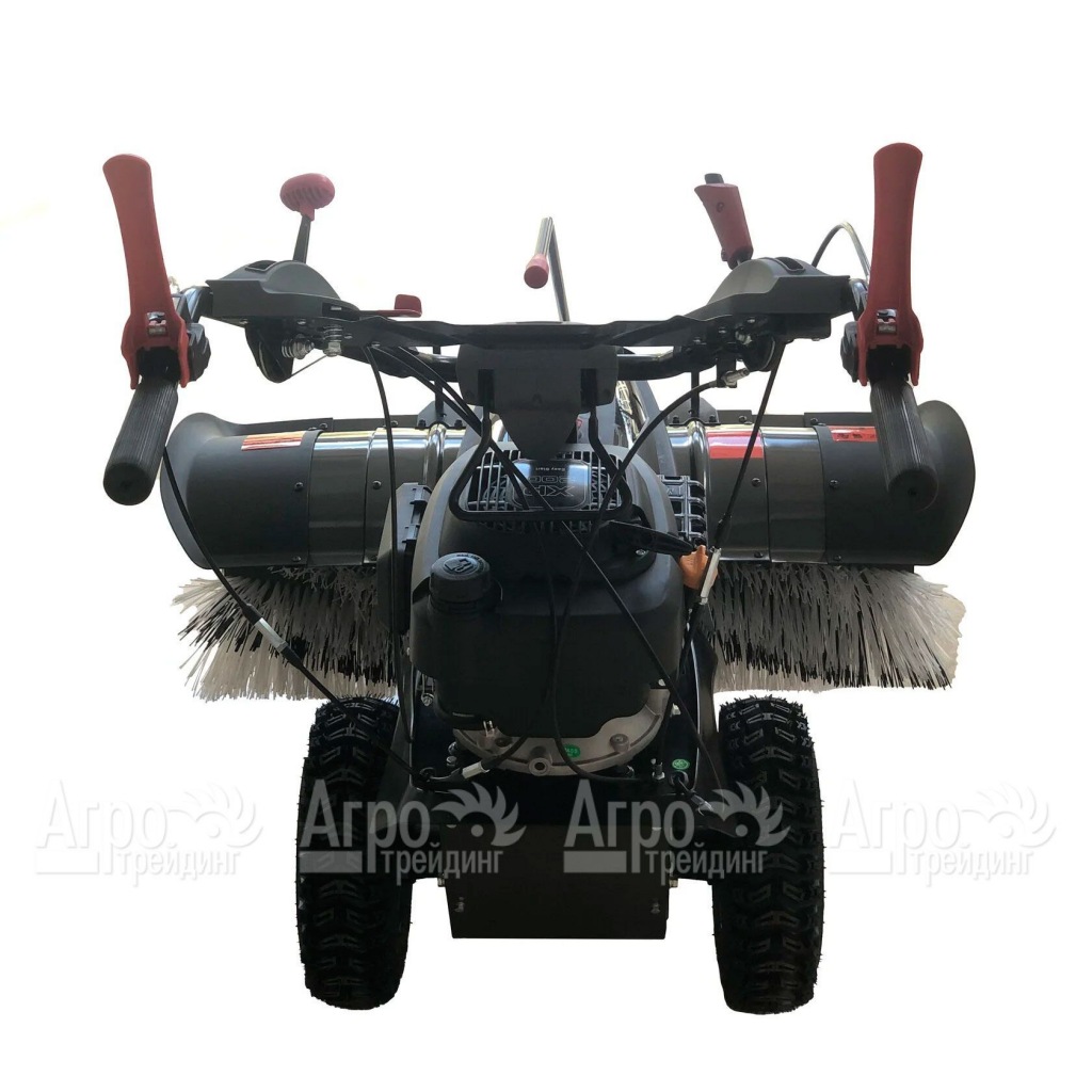 В основе агрегата лежит компактный и мощный двигатель внутреннего сгорания. Мотор легко запускается ручным стартером и потребляет совсем немного топлива. Рабочим инструментом подметальной машины является щётка, изготовленная из износостойкого полимера. Угол поворота щётки можно регулировать, повышая эффективность сметания. Все органы управления техникой расположены под рукой оператора. Ручка управления регулируется по высоте. Широкие пневматические колёса с глубоким протектором обеспечивают уверенное продвижение агрегата по любой поверхности.