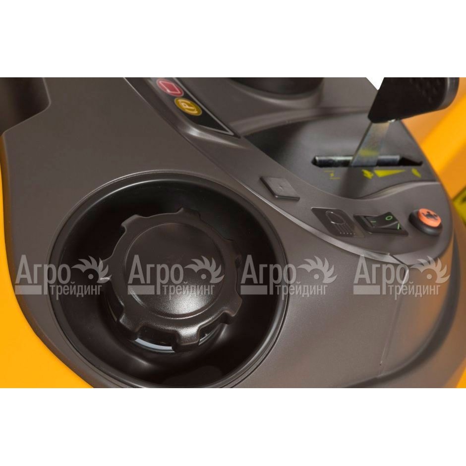 В основе трактора лежит мощный бензиновый двигатель. Он достаточно экономичный для агрегатов такой мощности. Запускается мотор электрическим стартером с панели управления. Режущая часть состоит из плавающей деки с двумя роторными ножами. Данная система позволяет качественно выкашивать траву даже на неровных участках. Ширина кошения большая. За один проход трактора можно привести в порядок значительную площадь газона. Высота кошения регулируется рычагом. Растительная срезка собирается в травосборнике большого объёма, о заполнении которого оповестит датчик на приборной панели. Чтобы освободить ёмкость от скошенной травы, достаточно воспользоваться отдельным рычагом.